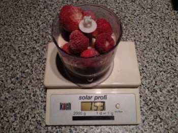 6) Ca. 150 Gramm gefrorene(!) Erdbeeren in den Mixer geben.
