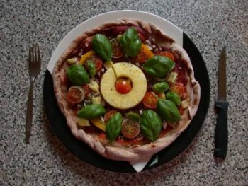 - Die fertig gebackene Pizza mit italienischen Kräutern (frisch oder als Fertigmischung) bestreuen, mit frischen Basilikum-Blättern belegen ... und genießen!